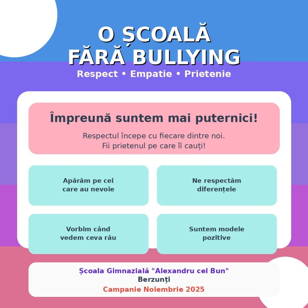 📌 Bullying-ul nu are loc în școala noastră! Fiecare copil merită să se simtă în siguranță, respectat și apreciat.